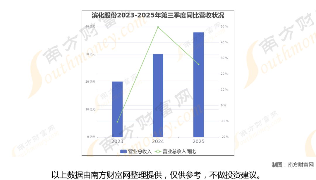 于2025年第三季度,滨化股份披露了其业绩表现(如上图),其中主营业务收入37.94亿元,相较于去年同期26.13%。
