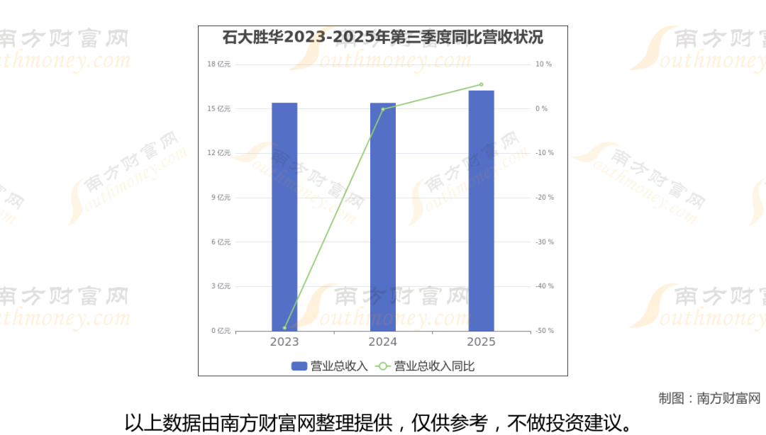 在2025年第三季度,石大胜华的业绩表现(如上图),主营业务收入达到16.24亿元,实现了5.5%的同比增长率。