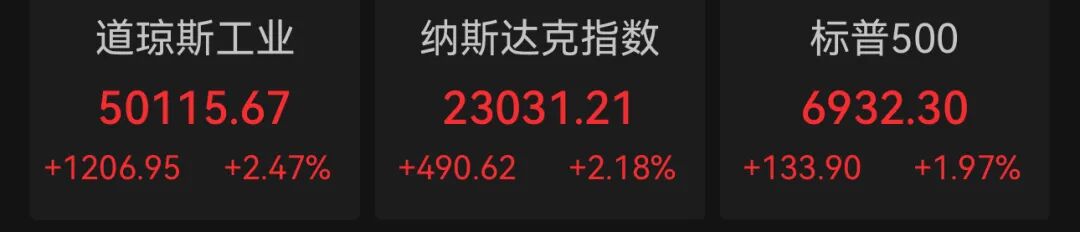 截至收盘,道琼斯工业平均指数上涨2.47%,报50115.67点,创历史新高收盘纪录;标普500指数上涨1.97%,报6932.30点;纳斯达克综合指数上涨2.18%,报23031.21点;反映小盘股市场表现的罗素2000指数大涨3.6%。标普500指数距离上周创下的历史最高收盘点位不足1%,纳斯达克指数仍较去年10月高点低约4%。