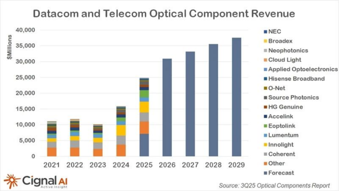 市场研究机构Cignal AI报告显示,2025年光器件市场营收将创历史新高,数通板块的营收预计超过180亿美元,相干光模块营收则达到近60亿美元。从2024年到2029年,数通光模块市场营收预计将以超过20%的复合年增长率持续增长,到预测期末将达到近290亿美元。