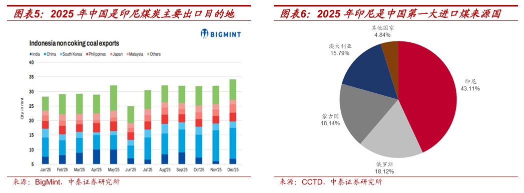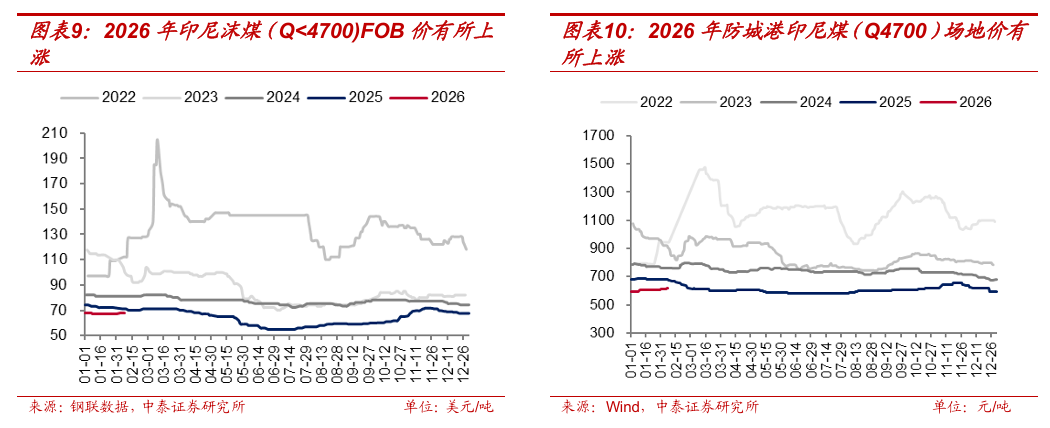 减产政策或指向财政增收。印尼政府拟征收煤炭出口税以扩充财政收入。2025年12月上旬,印尼财政部长普尔巴亚·尤迪·萨德瓦确认从2026年1月1日起征收煤炭出口关税。12月31日,萨德瓦透露,拟议提案将采用分级制实施关税,税率分别为5%、8%和11%,最终税收将取决于煤炭价格水平。但由于实施机制尚未最终确定而推迟。2026年1月30日,据Mysteel报道,萨德瓦表示煤炭出口税的法律框架(含相关立法程序及最终关税结构)仍在敲定中,并且拟议的煤炭出口税税率设定为5%至8%的区间,较此前提出的5%至11%税率方案有所收窄。我们认为,印尼政府推进煤炭出口税并同步压降RKAB生产额度,其核心政策意图或为在优先保障其国内能源安全的基础上,通过主动收缩煤炭供给以抬升煤价,进而提升国家财政收入。