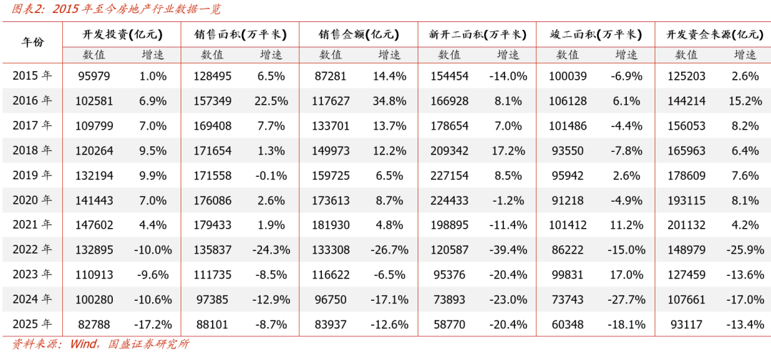 地产销售及价格数据存改善信号,行业基本面有望趋于筑底。价格上看,根据中指研究院数据,2026年1月中国100个城市新建住宅平均价格为每平方米17114元,环比上涨0.18%,同比上涨2.52%,新房销售价格边际改善。成交量上看,据克而瑞数据,重点监测的13个城市2026年1月二手房成交面积约810万平方米,环比上升16%,同比上涨33%,相比上年月均水平增长18%。2025年我国房地产开发投资、商品房销售面积、商品房销售金额、新开工面积、竣工面积、房地产开发资金来源等核心指标均持续深度调整,上述指标规模已分别较各自峰值下滑44%/51%/54%/74%/43%/54%,绝对值已降至历史低位。在政策托底背景下,预计基本面指标后续降幅有望收窄,行业将呈现逐步筑底。