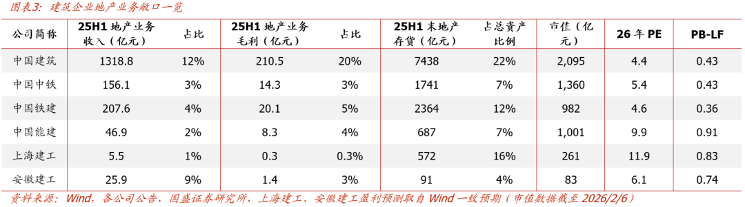 部分建筑龙头的地产开发业务占比高,有望直接受益地产销售改善,驱动盈利与估值修复。其中中国建筑2025H1地产业务收入占比12%,毛利占比20%,地产存货占总资产的22%,地产业务占比最高,目前地产存货减值风险是压制估值的核心因素之一,若地产板块企稳回升,则业绩与估值修复弹性较大。从地产存货角度看,除中国建筑外,中国铁建、中国中铁、中国能建、上海建工在手规模也较大,后续若销售出现持续性改善,亦有望贡献较大业绩与估值弹性。