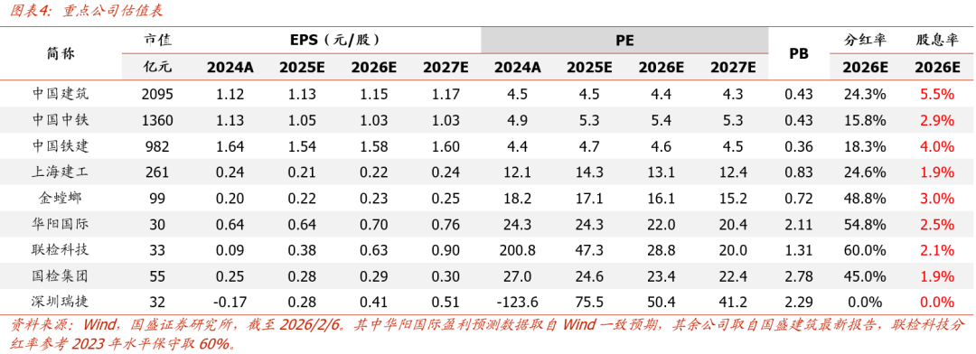 2026年以来地产行业持续迎积极政策催化,且1月地产成交量价数据存回升信号,后续行业基本面有望筑底企稳。建筑地产链龙头剩者为王,市占率有望持续提升,有望重点受益地产行业预期改善,重点推荐和关注央国企地产链龙头中国建筑(26PE 4.4X,26E股息率5.5%),中国铁建(26PE 4.6X,26E股息率4.0%),上海建工(26PE 13X);装饰龙头金螳螂(26PE 16X),亚厦股份;房建设计龙头华阳国际(26PE 22X);检验检测龙头联检科技(26PE 29X),国检集团(26PE 23X),深圳瑞捷等。