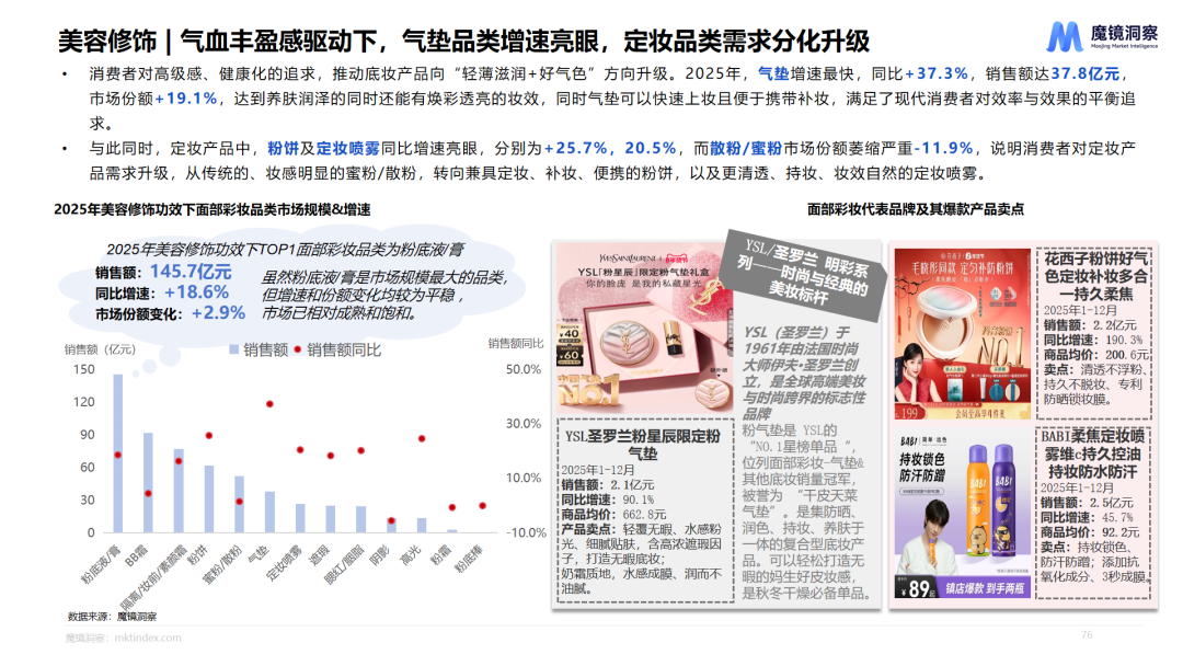 2025年,抗衰抗皱产品销售额达1298.3亿元,同比增长26.3%。面部抗衰抗老产品仍主导市场,面部护理套装、面部精华及乳霜品类销售额占比靠前。身体护理销售额同比增幅最高,达146.7%,消费者抗衰抗皱需求从面部向身体延伸,对全身抗衰抗老的重视度提升。- 美妆市场:妆容趋势以“健康化”为底色,向“高级感”升级,高贵风妆容作为代表妆容推动市场相关产品增长