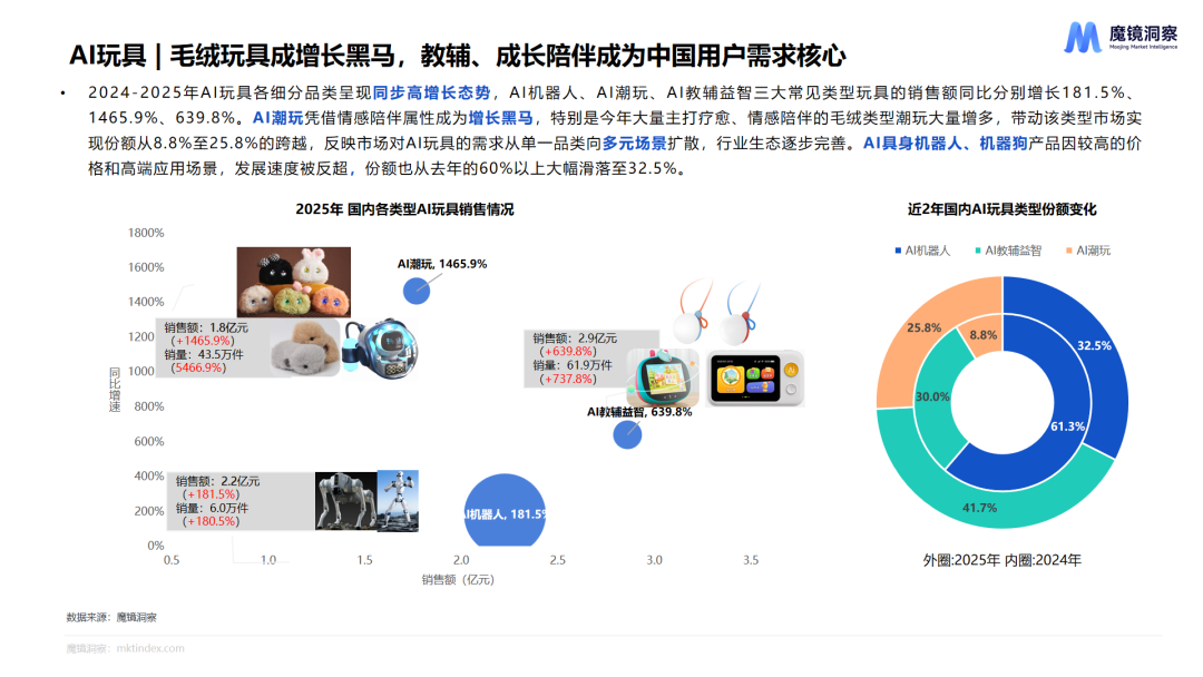 2025 年上半年,罗马仕充电宝爆炸事件及国家监管总局对不合格充电宝厂家3C认证的撤销和暂停,导致未获 3C 认证或问题批次产品快速退出市场。6月后,通过3C认证的充电宝爆发式增长,全年总销售额达48.4亿元(同比 1563.3%),销量3811.5万件(同比 1935.7%)。热门产品聚焦“快充、便携、多接口”等核心需求,兼顾性能与使用体验。- AI玩具线上市场爆发增长,毛绒玩具成增长黑马,教辅、成长陪伴成为中国用户需求核心