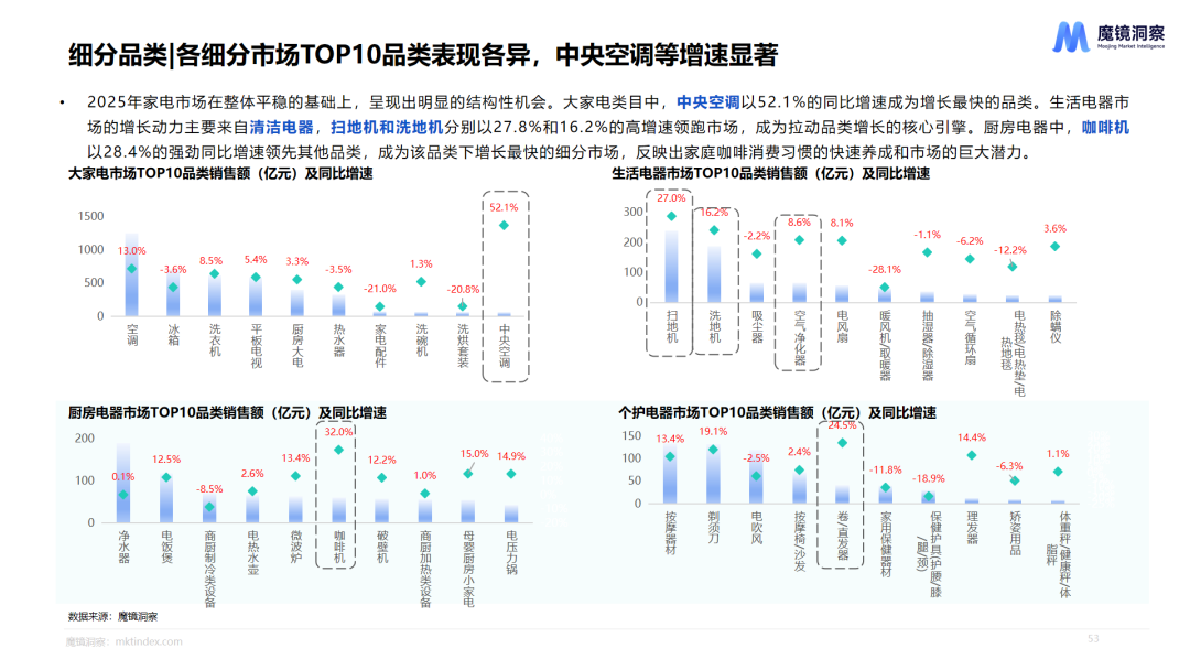 - 各细分家电市场均呈现增长趋势,大家电稳居市场主导地位,同时厨房电器和生活电器表现亮眼