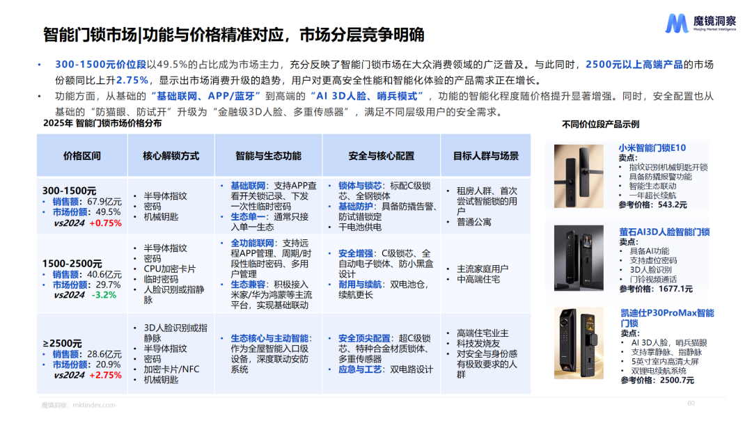 2025年中国家电市场各细分领域均呈现稳健增长态势。大家电以4594.4亿元的销售额稳居市场主导地位,同比增长7.0%,中央空调更以52.1%的惊人增速成为增长最快的品类。厨房电器和生活电器虽市场规模相对较小,但增长势头更为强劲,销售额分别达到1359.3亿元和1062.8亿元,同比增速均为10.4%。- 智能门锁市场实现爆发式增长,头部品牌凭借 AI 技术优势进一步提升市场集中度,消费者对安全功能的需求则持续助推行业高端化发展