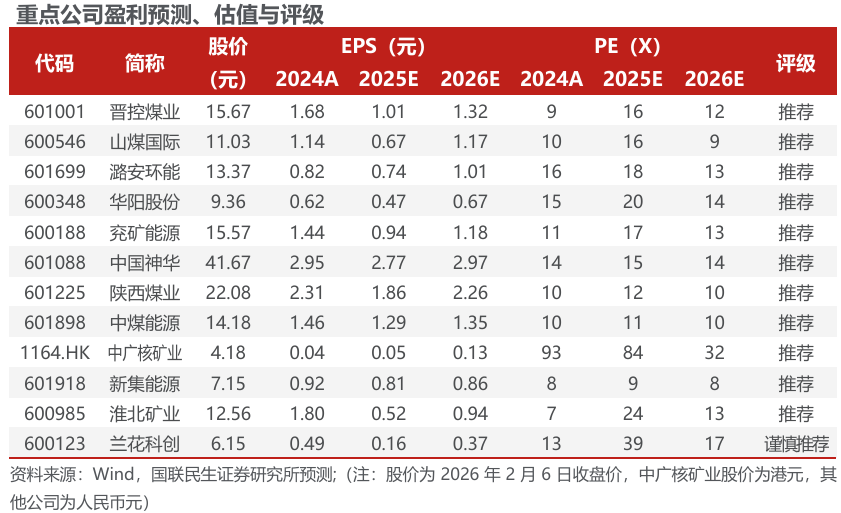 投资建议:标的方面,我们推荐以下投资主线:1)高现货比例弹性标的,建议关注晋控煤业、山煤国际、潞安环能、华阳股份、兖矿能源。2)行业龙头业绩稳健,建议关注中国神华、陕西煤业、中煤能源。3)受益核电增长,强α稀缺天然铀标的,建议关注中广核矿业。