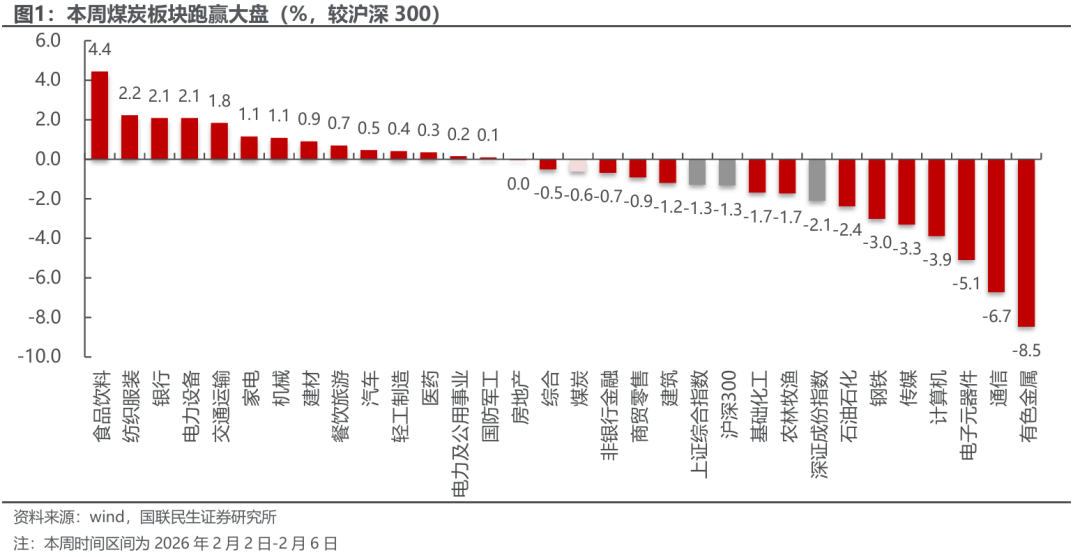 截至2月6日,本周中信煤炭板块周跌幅0.6%,同期沪深300周跌幅1.3%,上证指数周跌幅1.3%,深证成指周跌幅2.1%。