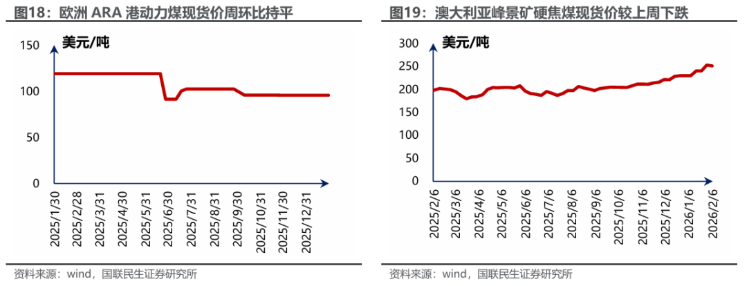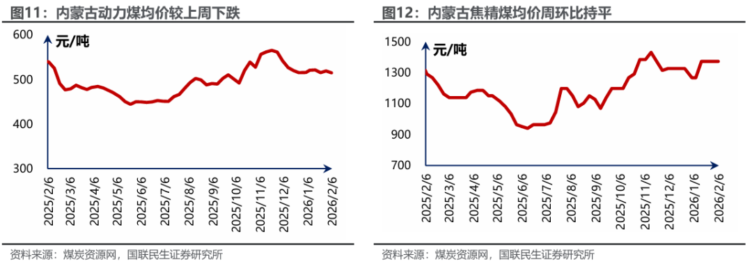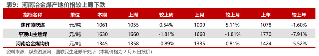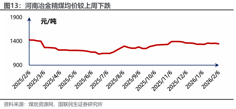 供需双弱,焦煤价格节前偏弱运行。本周焦煤价格有所下滑,供给端,部分煤矿已进入春节假期,伴随下周停产煤矿增多,供应将逐步收缩;需求端,焦企补库已接近尾声,按需采购为主,钢厂铁水产量周环比略有回升,亦维持刚需采购,节前焦煤价格或偏弱运行。