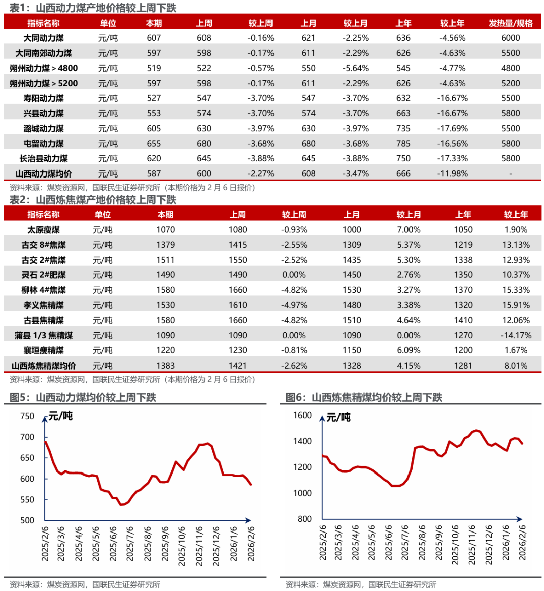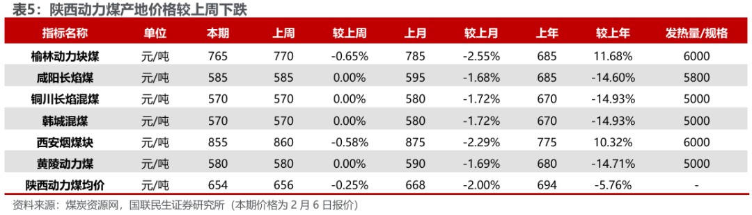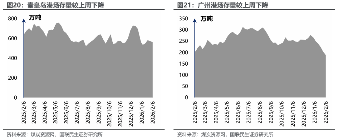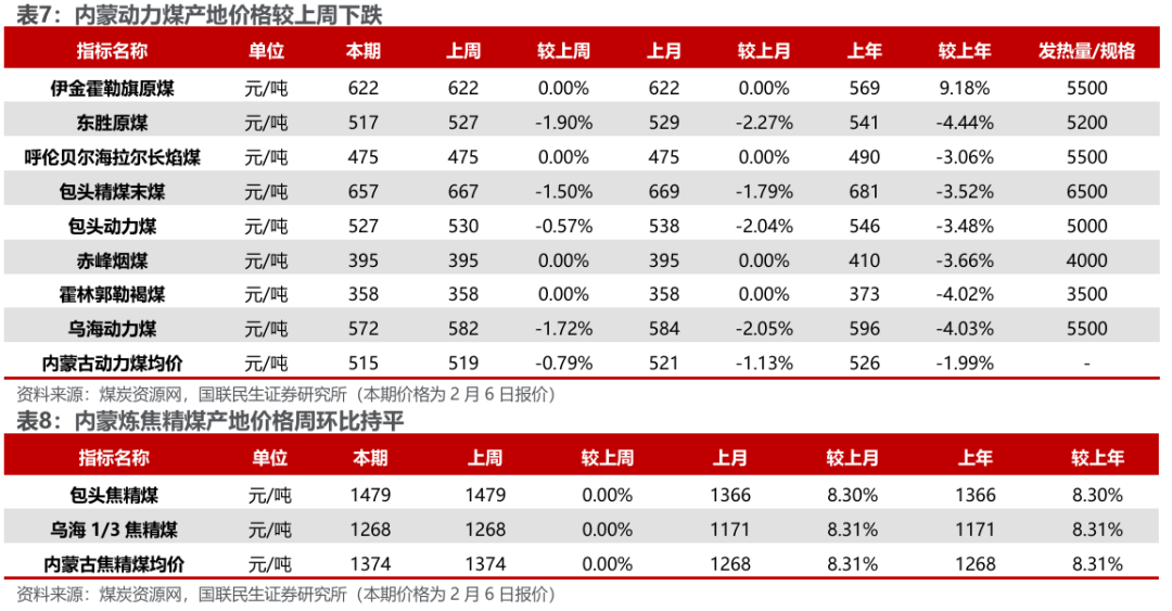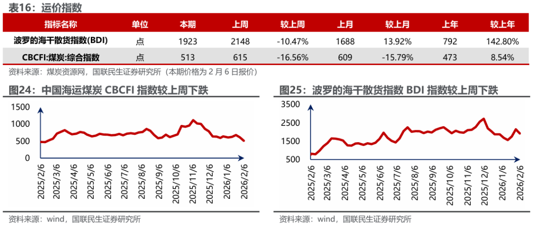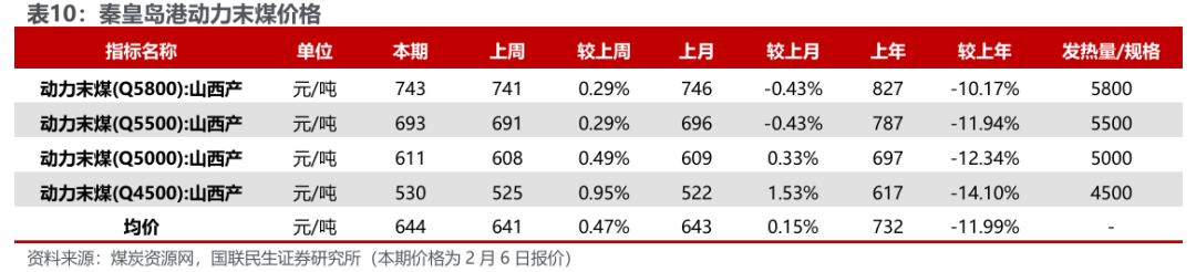 电厂周均日耗周环比下降,可用天数增加,化工需求环比增长。据CCTD数据,2月5日二十五省电厂日耗为584.1万吨,周环比下降80.7万吨,同比上升107.8万吨;周均日耗611.8万吨,周环比下降58.4万吨,同比上升169.6万吨;可用天数20.4天,周环比增加2.3天,同比减少4.6天。截至2月6日当周化工行业合计耗煤752.74万吨,同比增长8.2%,周环比增长0.2%。