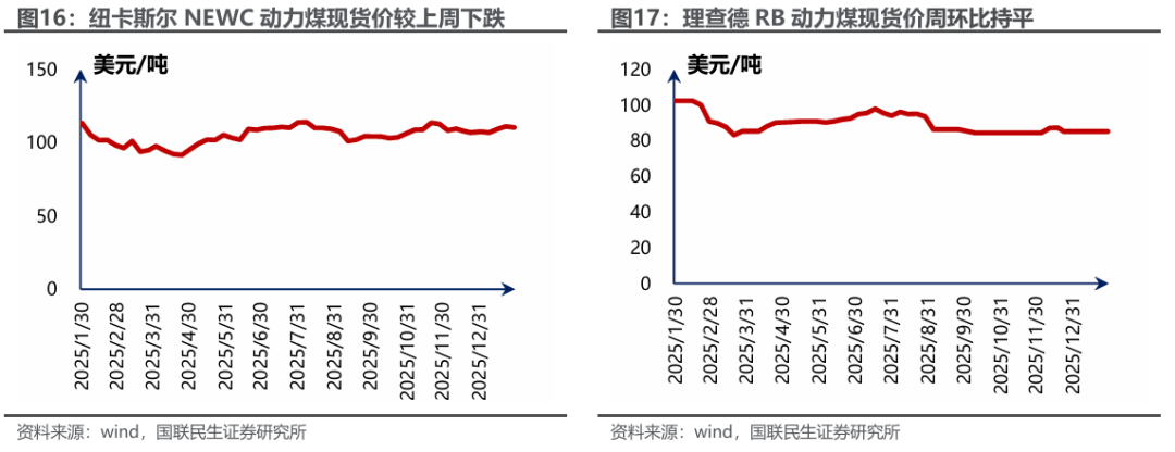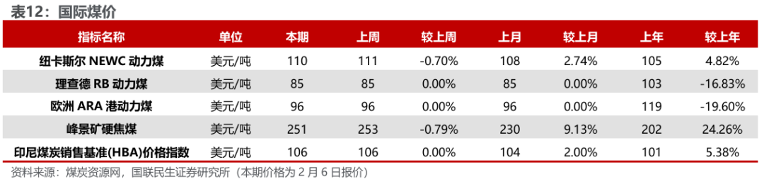 印尼减产增强供给收缩预期。2月4日路透社发布消息,印尼行业官员表示,由于印尼政府提出大幅减产计划,该国矿商已暂停现货煤炭出口。印尼上月向主要矿商下达的产量配额比2025年水平降低40%至70%,旨在提振煤价。印尼能矿部长早在1月初即表示预计2026年印尼将批准6亿吨的煤炭生产额度,2025年印尼目标和实际产量分别为7.397、7.9亿吨,若严格执行6亿吨额度,实际减产幅度为24.1%,考虑印尼实际产量或高于目标,不排除后续放松配额审批的可能。就中国进口而言,2025年中国自印尼进口煤炭2.11亿吨,占印尼出口量40%,按印尼煤炭出口合同中长协占比约65%、现货占比35%估计,中国现货进口量7385万吨;若2026年严格执行6亿吨生产计划,印尼国内DMO维持2.54亿吨,现货出口占比及出口中国份额维持不变,中国现货进口量或减少4887万吨,占2025年总进口量的10.0%、总供给(国内原煤产量 进口量)的1.0%。