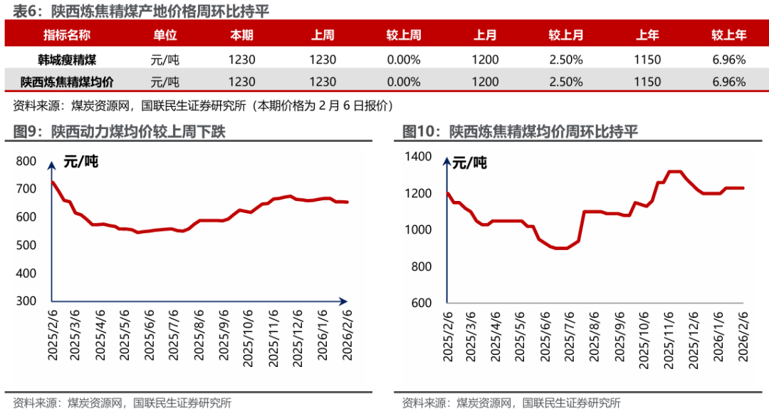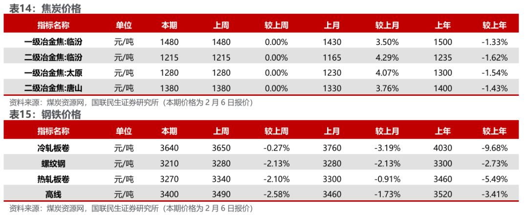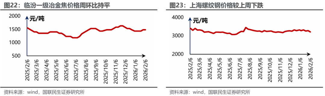 焦炭价格暂稳。据Wind数据,截至2月6日,唐山二级冶金焦市场价报收于1380元/吨,周环比持平;临汾二级冶金焦报收于1215元/吨,周环比持平。港口方面,2月6日天津港一级冶金焦价格为1610元/吨,周环比持平。