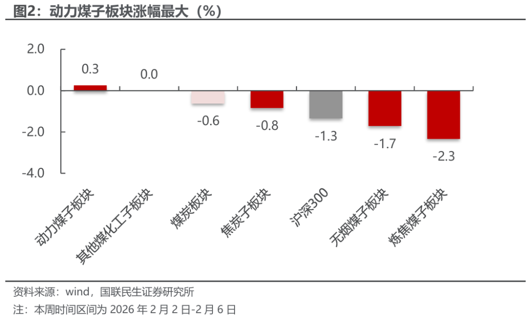 截至2月6日,中信煤炭板块周跌幅0.6%,沪深300周跌幅1.3%。各子板块中,动力煤子板块涨幅最大,涨幅0.3%;炼焦煤子板块跌幅最大,跌幅2.3%。