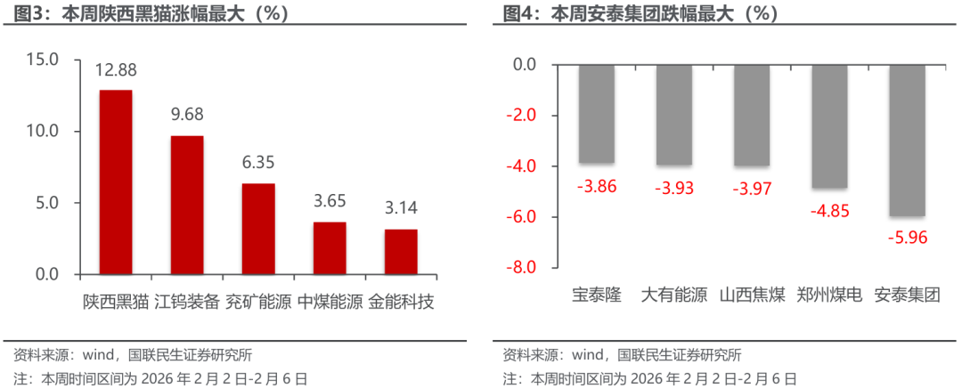 本周陕西黑猫涨幅最大。截至2月6日,煤炭行业中,公司周涨幅前5位分别为:陕西黑猫上涨12.88%,江钨装备上涨9.68%,兖矿能源上涨6.35%,中煤能源上涨3.65%,金能科技上涨3.14%。