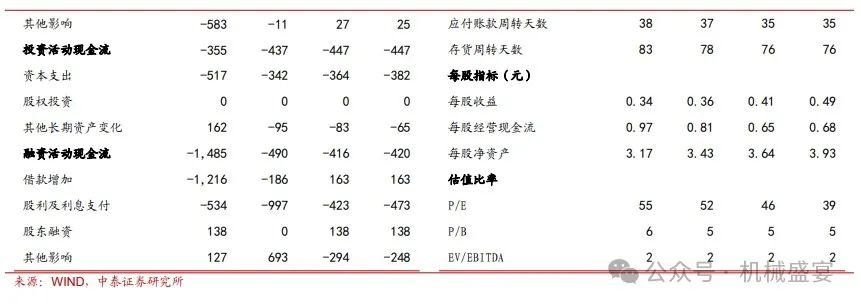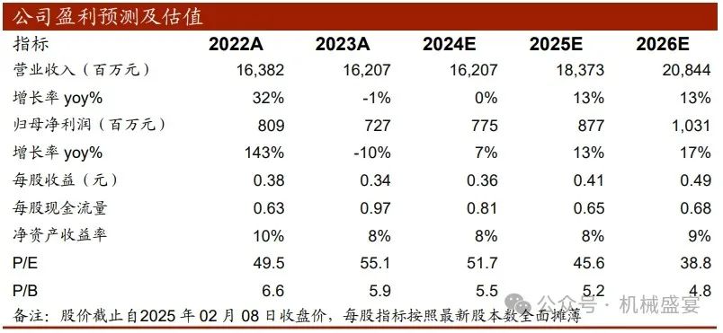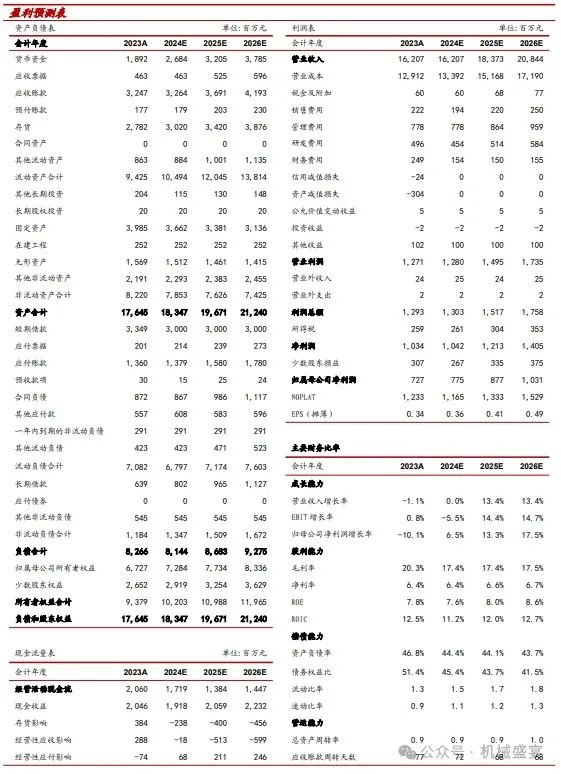 ◼ 因此,2024-2026年我们预计公司营业总收入实现同比增长0%、13.37%和13.45%。其他财务相关数据根据往年情况及最新一期公司公告合理预测,规模效应之下公司销售费用率、管理费用率预计维持或小幅降低,我们预计2024-2026年,公司销售费用率均为为1.2%,管理费用率分别为4.8%、4.7%、4.6%,研发费用率分别为2.8%、2.8%、2.8%。