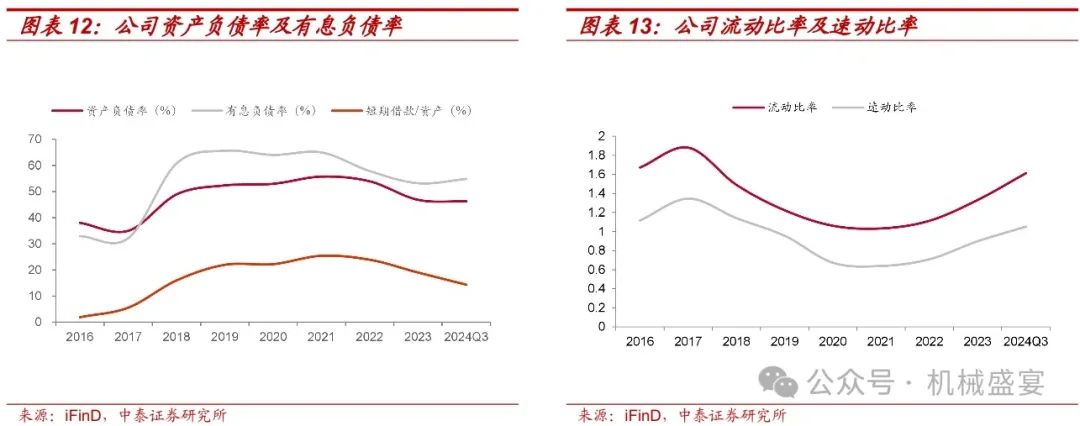 ◼ 资产负债结构改善,偿债能力恢复。1)公司资产负债率和有息负债率在2018年至2021年间存在一定波动,在2022年至2023年有所下降,公司在负债管理方面改善。短期借款占资产的比例在2016年至2021年呈上升趋势,在2021年至2024年第三季度逐步下降。2)公司流动比率和速动比率在2018年至2021年略有下滑,在2022年至2024年第三季度有所回升。总体来看,公司在2022年之后偿债能力有所恢复、韧性较强。