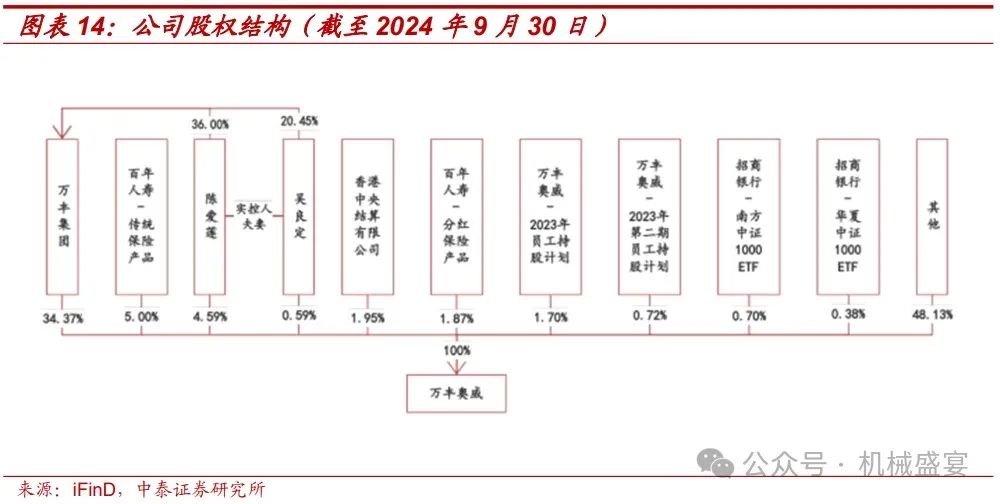 ◼ 股权结构清晰,实控人持股集中稳定。截至2024年9月30日,公司前 10 名股东中,万丰集团持有公司 34.37%的股份,是公司的控股股东,陈爱莲女士持有公司 4.59%的股份,并持有万丰集团 36.00%的股权,吴良定先生持有公司 0.59%的股份,并持有万丰集团 20.45%的股权,陈爱莲女士和吴良定先生为夫妻关系,同为公司的实际控制人。