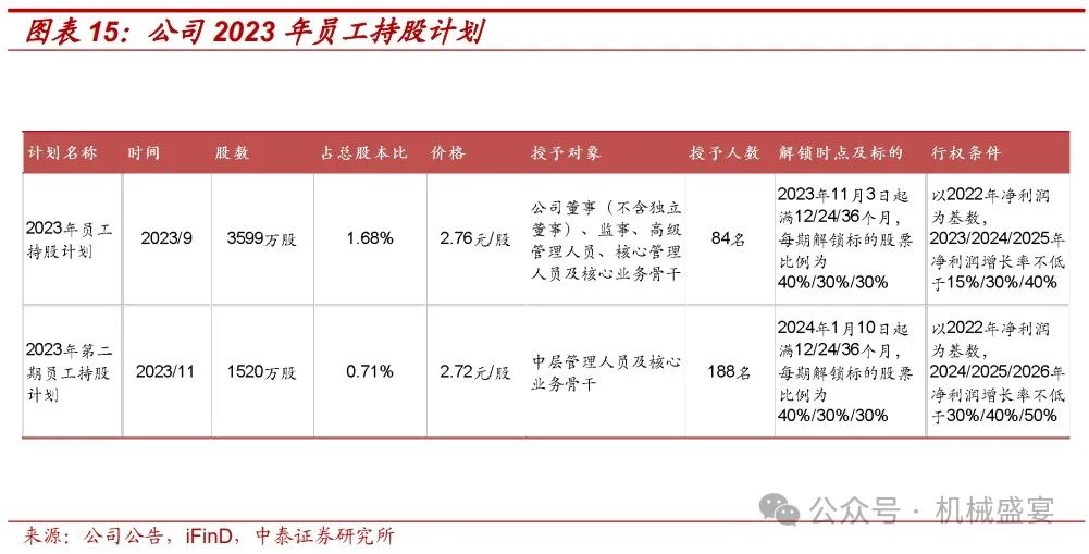 ◼ 员工持股提升公司凝聚力,彰显业绩提升信心。2023年9月,公司推出2023年员工持股计划,向公司董事、监事、高级管理人员、核心管理人员及核心业务骨干共84人(其中包括董监高14人)授予了总计3599万股(占总股本1.68%),并在2023年11月3日起满12/24/36个月后解锁标的股票40%/30%/30%,业绩考核目标为:以2022年净利润为基数,2023/2024/2025年净利润增长率不低于15%/30%/40%。同年11月,公司发布了2023年第二期员工持股计划,向188名中层管理人员及核心业务骨干授予1520万股(占总股本0.71%),并在2024年1月10日起满12/24/36个月后解锁标的股票40%/30%/30%,业绩考核目标为:以2022年净利润为基数,2024/2025/2026年净利润增长率不低于30%/40%/50%。