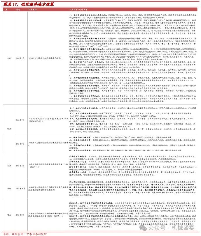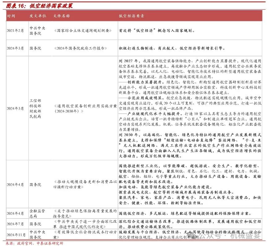 ◼ 国内低空经济政策持续加码,顶层设计不断完善。2021年2月, 国务院发布《国家综合立体交通网规划纲要》,“低空经济”概念首次被写入国家规划。2024年3月,国务院在《2024年国务院政府工作报告》中提出,积极打造低空经济等新增长引擎。2024年3月,四部门联合发布《通用航空装备创新应用实施方案(2024-2030年)》,明确了2027年和2030年低空经济的发展目标。2024年4月,国务院发布《推动大规模设备更新和消费品以旧换新行动方案》,金融监管总局发布《关于推动绿色保险高质量发展的指导意见》,均提到低空经济相关的配套支持和保障。2024年7月,国务院发布《中共中央关于进一步全面深化改革 推进中国式现代化的决定》,强调深化综合交通运输体系改革,推进铁路体制改革,发展通用航空和低空经济,推动收费公路政策优化。2024年11月,中共中央、国务院发布《有效降低全社会物流成本行动方案》,鼓励发展与平台经济、低空经济、无人驾驶等相结合的物流新模式,健全和优化管理标准规范,支持企业商业化创新应用。