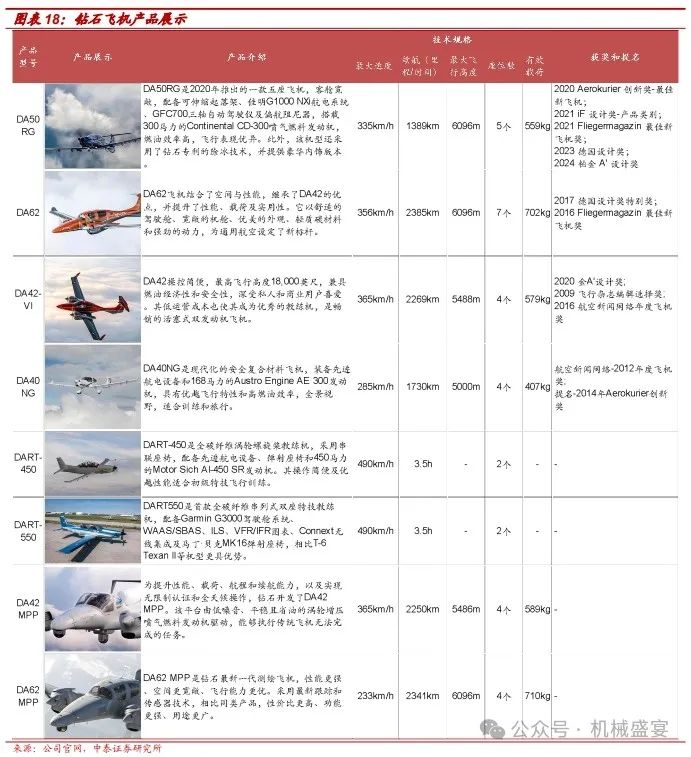 ◼ 钻石飞机产品系列丰富,应用场景广泛。1)公司拥有轻型运动飞机系列以及钻石系列飞机DA20、DA40、DA42、DA62 和DA50、DART 等10 种基本型、18 款机型的知识产权。其中,钻石 DA50RG 机型获得德国 IF 设计奖、Aerokurier 最具创新飞机奖、Flieger 最优燃油飞机奖以及 2023 年德国设计奖等。2)其主要产品可应用于私人飞行、航校培训、短途运输和特种用途等多个场景。主力机型DA40、DA42、DA20广泛应用于航校培训中,服务于全球各地的专业飞行学院及航空公司培训中心。