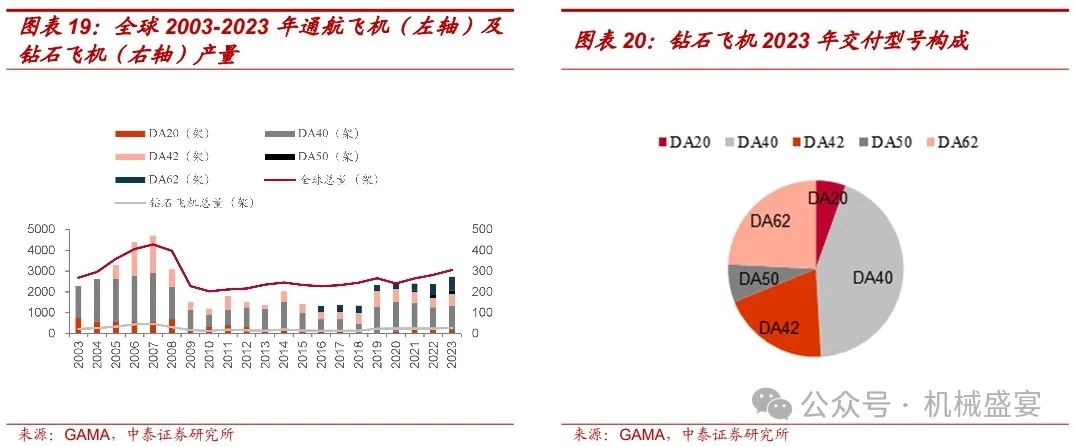 ◼ 研发实力雄厚,适航取证领先同行。1)截至2023年,公司拥有18款机型的全部产权,研发实力雄厚。公司旗下钻石飞机在整机设计研发、发动机制造技术、新材料技术和先进制造领域具备同行领先的技术研发优势,是欧洲为数不多的 EASA(欧洲民航局)批准的DOA(飞机设计组织),储备了大量的通用航空研发设计人才,在全球拥有大量通用飞机研发与设计技术储备。2)在产业链布局方面,公司实现了关键零部件的自主可控,在发动机、飞机机身机翼等核心零部件的设计生产环节建立了领先的自主可控优势;在发动机技术方面,公司是行业内唯一具有自主知识产权的通用活塞发动机;复合材料技术方面,钻石所有系列飞机全球率先整机采用碳纤维与玻璃纤维复合材料结构,在自有的生产线中进行生产成型装配。3)在适航取证方面,公司已获得中国民航局颁发的DA40NG、DA50RG飞机生产许可证PC以及DA62/DA42/DA40/DA20/DA50等多款飞机型号认可证VTC,适航取证能力在同行中处于领先地位。
