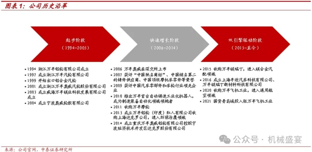 ◼ 快速增长阶段(2007-2014年):上市后,公司开始通过并购方式快速扩展业务版图。2007年,公司获评“中国驰名商标”等多项荣誉。2009年,公司被评为中国汽车零部件和车轮行业领先企业。2010年,公司推出万丰首台自动铸造工业化机器人。2011年,公司通过发行股份的方式收购了万丰摩轮75%的股权,增加了摩托车轮毂业务。2013年,公司通过收购上海达克罗涂复工业有限公司进入环保涂覆领域,并且成立了万丰铝轮(印度)私人有限公司。2014年,公司成立重庆万丰奥威铝轮有限公司,并控股宁波经济技术开发区达克罗股份有限公司。