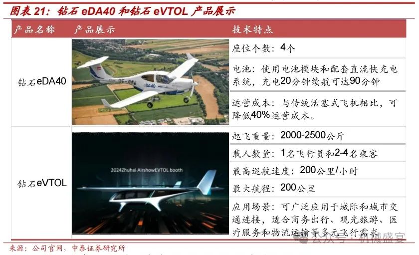 ◼ 钻石eDA40纯电动全新产品,现已斩获首份意向订单。1)万丰钻石eDA40机型是基于DA40机型单发四座飞机开发的全新产品,是世界第一架申请EASA/FAA Part 23认证的具有直流快充功能的电动飞机。该机型使用电池模块和配套直流快充电系统,充电20分钟,续航里程就可达到90分钟,与传统的活塞式飞机相比,该机型的运营成本可降低40% 以上。2)2023年7月20日,万丰钻石电动飞机eDA40在奥地利维也纳新城成功首飞。2024年5月,公司披露eDA40机型已经进入EASA适航取证阶段,该机型采用了最新液冷电池技术,公司将加快eDA40开发应用力度以及商业化进程。2024年6月20日,公司批露拉脱维亚波罗的海航校与公司达成购机意向,预购3架eDA40电动飞机及2架DA42-VI机型,这是万丰电动飞机获得的首份意向订单。