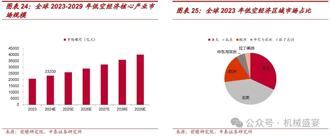 ◼ 全球低空经济前景广阔,北美市场份额比重大。据前瞻产业研究院数据,2023年,全球低空经济核心产业的市场规模达到了2.08万亿元,其中北美市场占据了超过40%的份额。预计2024年全球低空经济市场规模将增长至2.32万亿元,未来五年CAGR将达到11.51%。