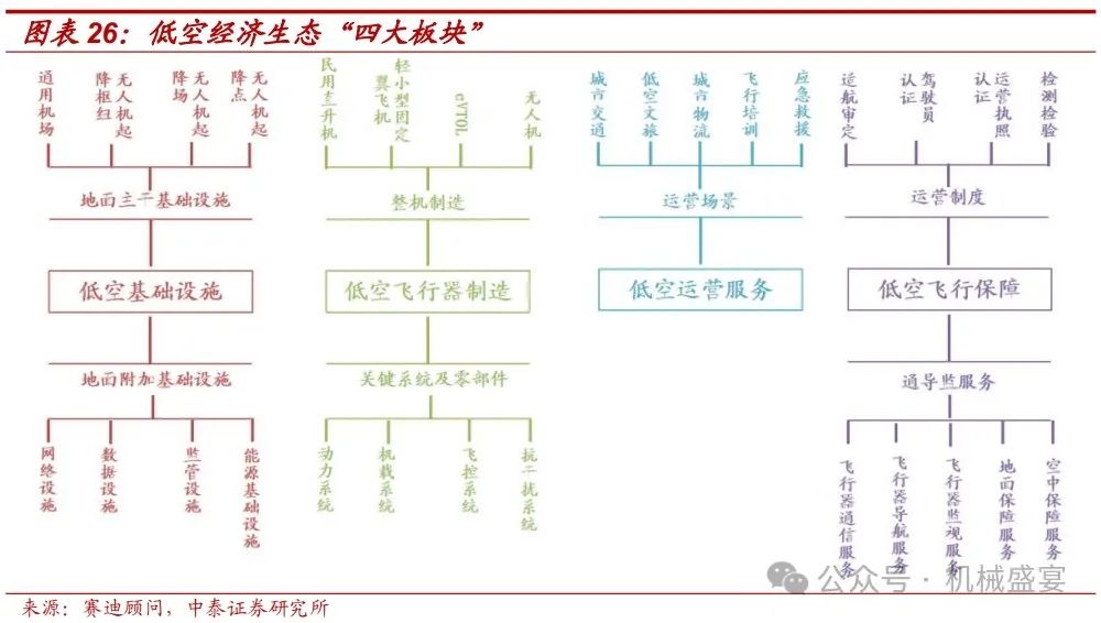 ◼ “四大板块”相互支撑,共同构建完整生态。1)低空经济生态的“四大板块”包括低空基础设施、低空飞行器制造、低空运营服务和低空飞行保障。2)低空基础设施涵盖地面主干和地面附加的基础设施建设,如通用机场、网络设施等;低空飞行器制造涉及整机制造和关键系统及零部件的生产,如eVTOL、动力系统等;低空运营服务包括城市交通、低空文旅、城市物流、飞行培训、应急救援等运营场景;低空飞行保障则涉及运营制度和通导监服务,如适航审定、飞行器通信等。