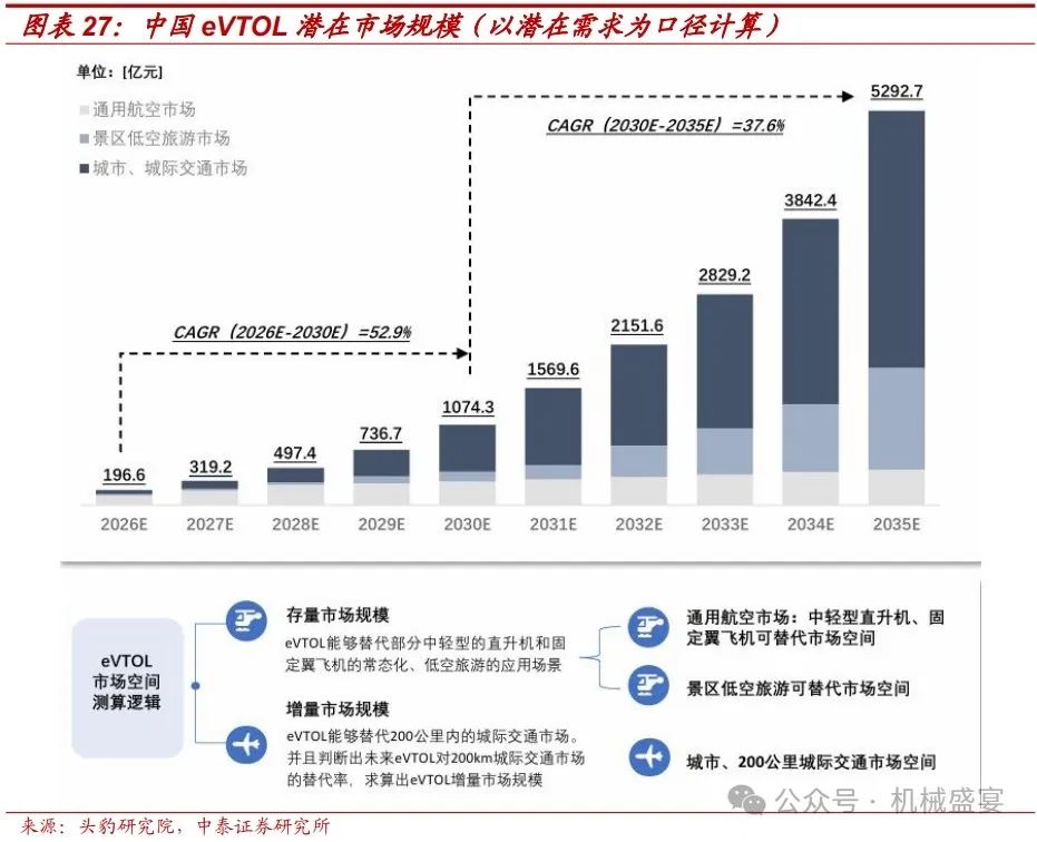 ◼eVTOL是最热细分赛道,首先渗透低空旅游和城际交通。1)全球航空大国正竞相研发eVTOL,以抢占未来城市低空智能交通的制高点。美国、英国、中国、德国和加拿大尤为突出,这些国家的研发项目数量约占全球的60%。2)据头豹研究院数据,中国eVTOL市场预计在2026年迎来商业化元年并开始快速放量。至2035年,预计中国eVTOL市场规模将达5292.7亿元。预计2026-2030年和2030-2035年中国eVTOL市场规模CAGR分别为52.9%和37.6%。3)从2026年起,eVTOL预计将首先渗透到低空旅游领域,随后逐步替代部分200公里内的城际交通需求,同时作为城际飞机和高铁出行的城市边缘至市中心运输延伸服务。此外,eVTOL还将部分替代和扩展直升机和固定翼飞机的传统应用场景。
