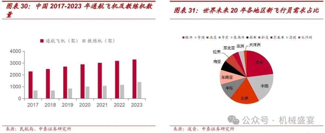 ◼ 航校飞行培训市场稳定增长,全球民航飞行员需求空间大。1)2017年至2023年,中国通航飞机和教练机的数量稳定增长,通航飞机和教练机分别从2017年的2297架和680架增长到2023年的3303架和1398架,预计未来将继续保持增长态势。2)据波音公司数据,未来20年全球将需要约67.4万新的民航飞行员,其中欧亚地区、中国和北美需求占比超过一半。