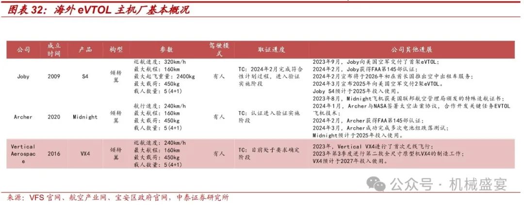 ◼ 海内外主机厂逐步进入取证&商用周期,海外eVTOL投用在即。1)国内主机厂普遍成立于2020年以后,其中亿航智能、峰飞航空成立时间较早;产品构型上多旋翼、复合翼、倾转旋翼均有涉及,其中多旋翼产品较为成熟。2)海外主机厂成立时间相对较早,普遍成立于2009-2020年间,产品构型以难度较大的倾转旋翼为主。根据多家海外头部公司媒体渠道,多款eVTOL产品有望在未来3年获得适航取证,JobyS4预计在2025年投用;Vertical Aeroscpace的VX4预计2027年投用。