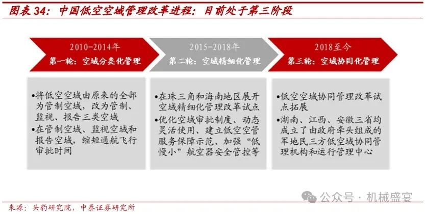 ◼ 中国低空空域管理改革,目前处于第三阶段。中国低空空域管理改革经历了三个阶段:2010-2014年为空域分类化管理阶段,将低空空域分为管制、监视和报告三类;2015-2018年为空域精细化管理阶段,在珠三角和海南地区展开试点,优化空域审批制度、动态灵活使用、建立低空空管服务保障示范、加强“低慢小”航空器安全管控;2018年至今为空域协同化管理阶段,低空空域协同管理改革试点拓展,湖南、江西、安徽三省成立由省政府牵头组成的军地民三方低空域协同管理机构和运行管理中心。目前,改革正处于第三阶段空域协同化管理。