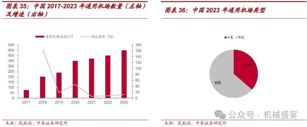 ◼ 国内通用机场数量增长,A类机场数量超过三分之一。1)2017年至2023年,中国通用机场数量从76个增加到449个,增速在2018年达到峰值后逐渐放缓,但每年均有一定比例的增长,这些通用机场的增长对低空经济基础设施建设起到了重要推动作用,为低空飞行活动提供了必要的基础设施支持。2)A类通用机场是指对公众开放的通用机场,允许公众进入以获取飞行服务或自行开展飞行活动。截至2023年底,A类通用机场有163个,约占总数的36%。