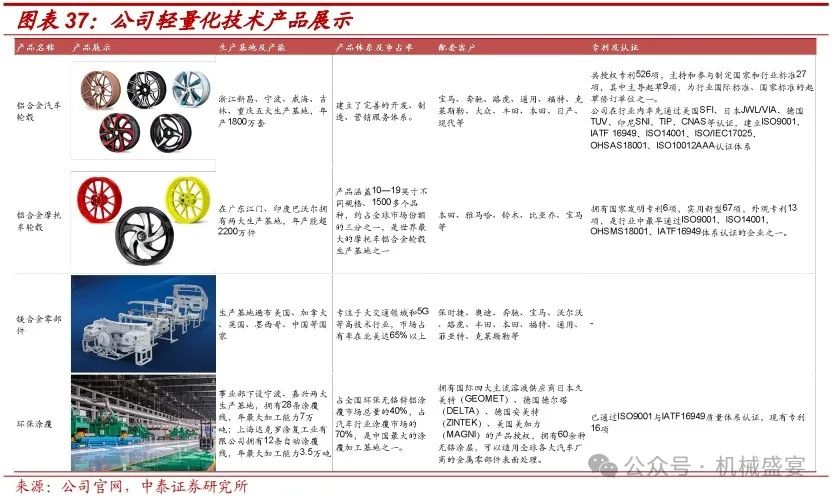 ◼ 公司金属部件轻量化产品聚焦铝/镁合金,主要产品为铝合金轮毂和轻量化镁合金部件。1)2023年,公司轻量化铝合金产品年产能 4,200多万套,致力于汽车、摩托车高端铝合金车轮研发、制造、销售及售后服务,实现细分行业全球领跑。2)作为轻量化镁合金新材料深加工业务全球领导者,年产能 1,800 多万套,在产品仿真设计、模具设计以及产品压铸等方面具备较强的竞争优势,同时公司产品储备丰富,并能够完成大型一体化镁合金压铸件的设计与制造,主要产品涉及动力总成、前端载体、仪表盘支架、后掀背门内板、侧门内板等汽车部件。