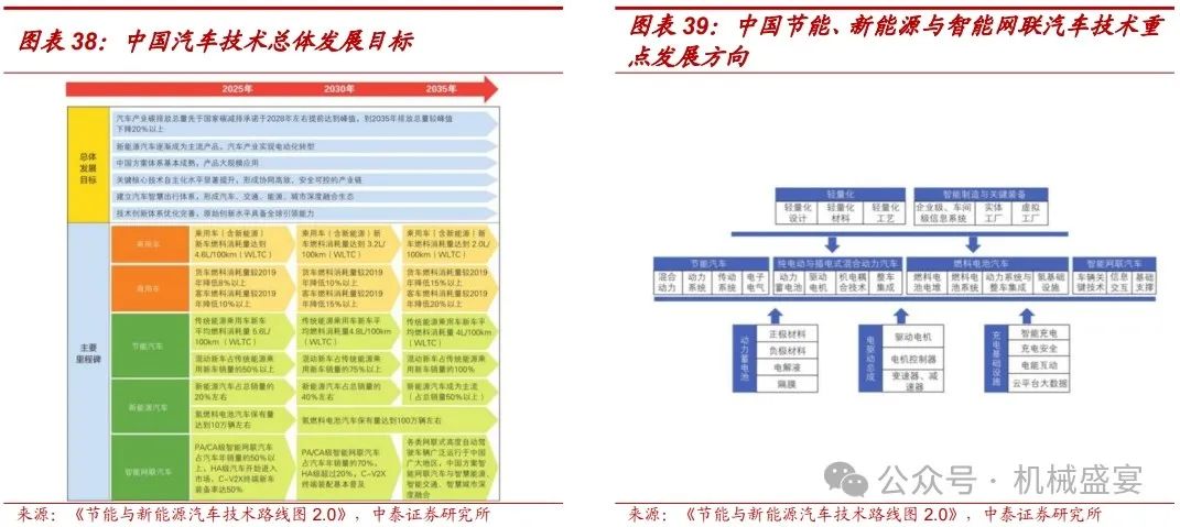 ◼ 汽车技术低碳化、信息化、智能化发展,轻量化为共性基础技术。1)《节能与新能源汽车技术路线图2.0》明确了全球汽车技术向“低碳化、信息化、智能化”的发展方向,并设定了至2035年我国汽车产业的发展目标:届时,汽车产业的碳排放总量将较峰值减少超过20%,新能源汽车销量占比将达到总销量的50%以上。2)在节能减排和新能源汽车性能提升需求的双重推动下,轻量化已成为汽车工业发展的必然趋势。根据欧洲铝业协会报告,燃油汽车质量每降低10%,可降低油耗8%;纯电动汽车整车重量若降10kg,续驶里程增加2.5km。3)此外,汽车轻量化是节能汽车、新能源汽车与智能网联汽车的共性基础技术,智能制造与关键装备技术是汽车产品生产质量的保障。