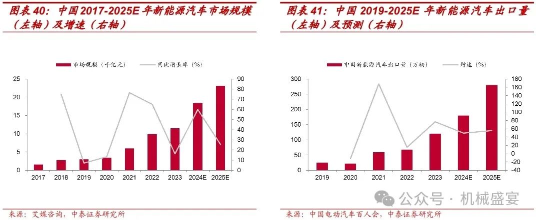 ◼ 新能源车国内市场增长迅速,国际化发展拓宽全球市场。1)据艾媒咨询数据,中国新能源汽车市场规模自2017年至2023年持续增长,至2023年达到了11.5千亿元,同比增长16.2%,预计未来两年这一趋势将继续保持。2)据中国电动汽车百人会数据,2023年中国新能源汽车出口量达到了120.3万辆,同比增长77.6%,占整车出口的比例达30%。2024年,中国电动汽车出口量首次突破200万辆。