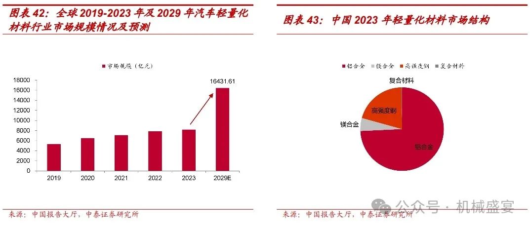 ◼ 轻量化市场高速增长,国内铝合金市场规模占比最大。1)2023年,全球汽车轻量化材料市场规模达到了8186.98亿元人民币。据《2024-2029年中国汽车轻量化行业竞争格局及投资规划深度研究分析报告》预测,到2029年,这一数字预计将增长至16341.61亿元,期间的CAGR预计为11.86%。2)2023年,国内汽车轻量化材料市场规模约为4225.8亿元。其中,汽车用铝合金占据了最大份额,规模达到3137.66亿元;其次是高强度钢,市场规模为865.87亿元;镁合金和复合材料的市场规模相对较小,分别为213.40亿元和8.87亿元。