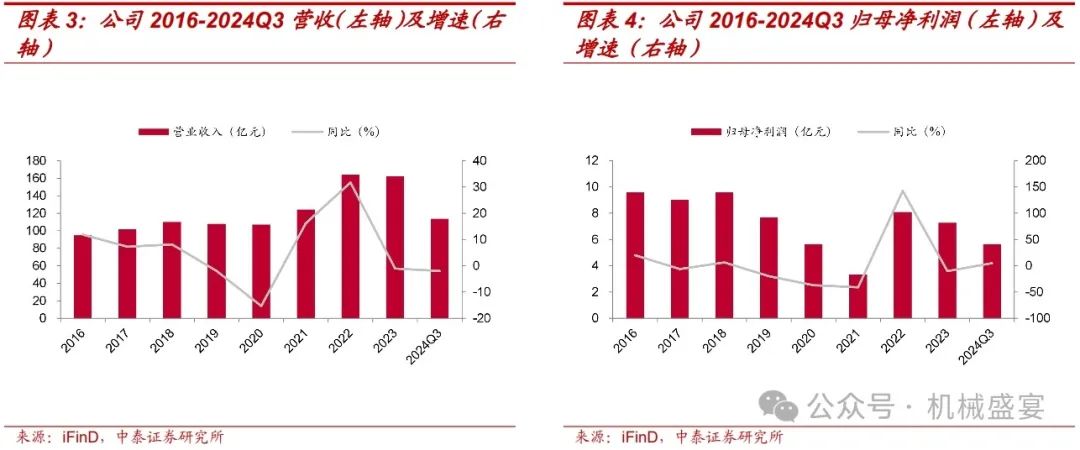 ◼ 营收稳步增长,净利润企稳回升。1)2016年至2022年,公司营收显著增长,CAGR达9.5%;2023年公司营收略有下滑但仍保持在较高水平。2)公司归母净利润在2019-2021年经历了一段时间的下滑,主要系摩托产品销售收入下降、汽车市场整体下滑导致销售下降、新建生产基地折旧费等运营成本提高、原材料价格上升和疫情影响。2022年公司归母净利润回升,而2023年公司归母净利润略有下滑,主要系计提无锡雄伟商誉减值2.79亿元所致,若剔除上述影响,2023年公司归母净利润同比增长24.35%。2024年前三季度公司归母净利润同比增长5.07%。