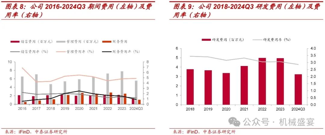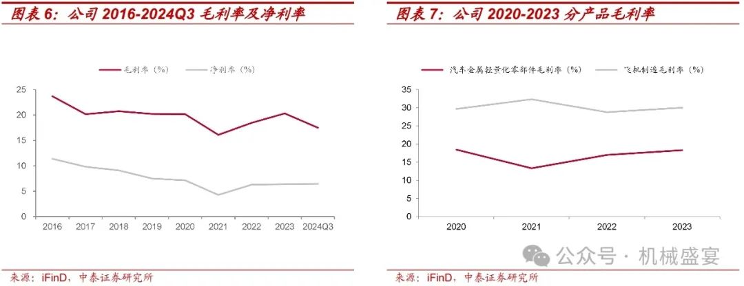 ◼ 整体毛利率和净利率保持稳定,飞机制造毛利率高于汽车零部件。1)公司整体毛利率在2016-2020年保持稳定,在2021年短期下滑,随后逐步回升,但2024年前三季度略有下降,毛利率下降均系汽车零部件毛利率下降影响所致。公司净利率在2021年前表现出下降态势,2021年后逐步回升。2)分产品来看,汽车金属轻量化零部件业务毛利率整体稳定,但在2021年出现小幅下滑,主要系原材料价格上涨幅度较大,价格联动结算滞后影响所致。飞机制造业务毛利率整体稳定并高于汽车金属轻量化零部件。2023年,汽车金属轻量化零部件业务和飞机制造业务毛利率分别为18.33%和30.05%。