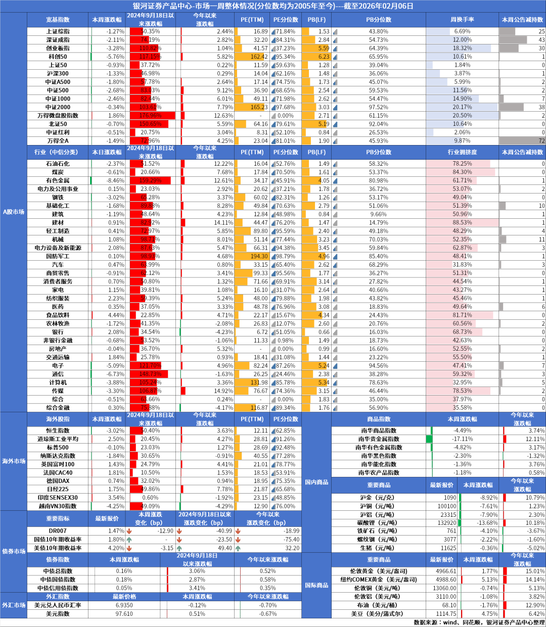 A股:本周市场大幅下跌后缩量震荡。宽基指数普遍收跌,大盘股强于中小盘,科创50大跌近6%,微盘股指逆势上涨。行业涨跌互现,食品饮料、纺织服装、银行、电力设备及新能源、交通运输领涨,有色金属、通信、电子、计算机、传媒大跌。近期宏观数据相对较少,情绪波动主导市场。