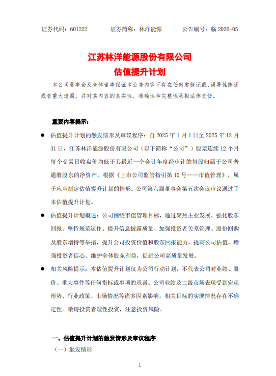林洋能源表示,自2025年1月1日至2025年12月31日,公司股票连续12个月每个交易日收盘价均低于其最近一个会计年度经审计的每股归属于公司普通股股东的净资产,根据《上市公司监管指引第10号——市值管理》,属于应当制定估值提升计划的情形。其中,2025年1月1日至2025年4月25日每日收盘价均低于2023年经审计的每股归属于公司普通股股东的净资产7.52元,2025年4月26日至2025年12月31日每日收盘价均低于2024年经审计的每股归属于公司普通股股东的净资产7.60元。