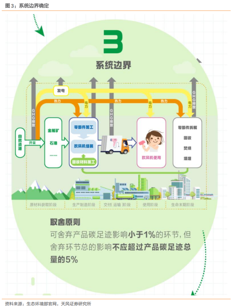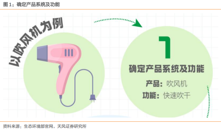 碳足迹是以生命周期评价方式进行量化,旨在评估生产和消费活动过程中排放的温室气体总排放量。我们根据生态环境部发布的《温室气体产品碳足迹量化要求和指南》海报,针对吹风机的案例,拆解碳足迹的量化方法。2.2.1. 确定产品系统及功能