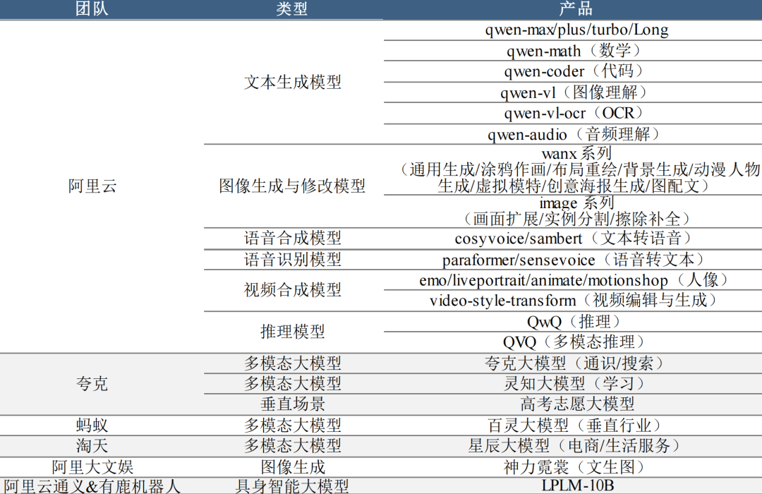 下表:阿里 AI 模型布局: