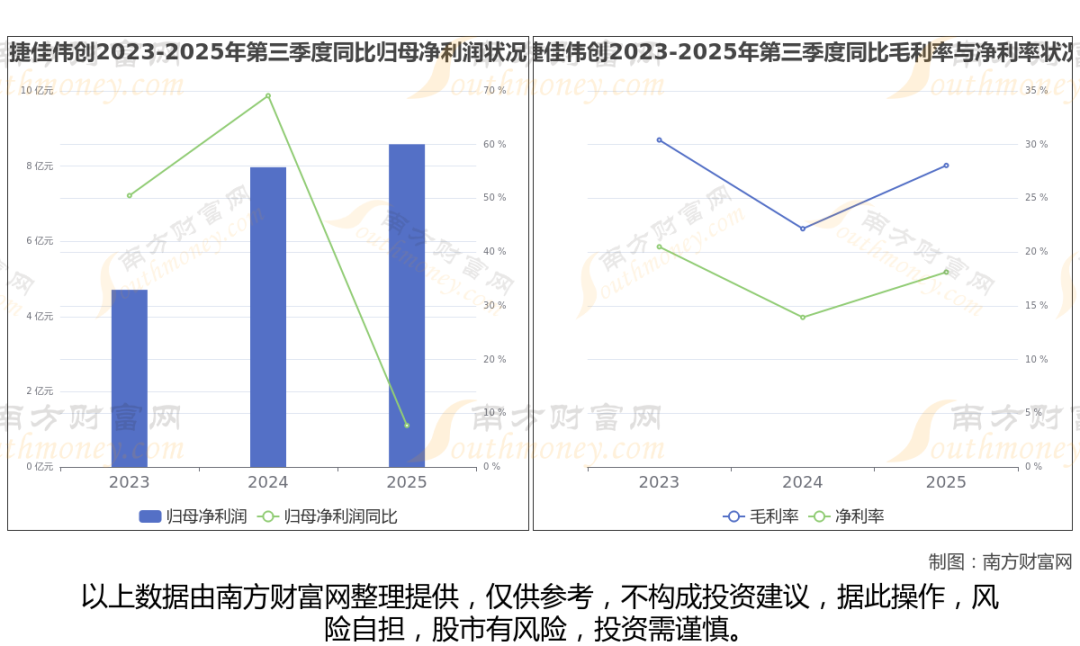 2025年第三季度季报显示,捷佳伟创公司毛利率28.06%,净利率18.13%,归属净利润8.58亿,同比增长7.72%。