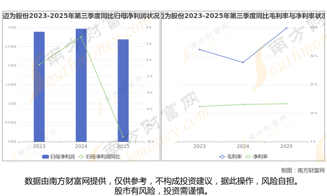 公司2025年第三季度季报显示,迈为股份实现净利润2.69亿,同比增长-9.42%;毛利润为7.93亿,毛利率39.81%。