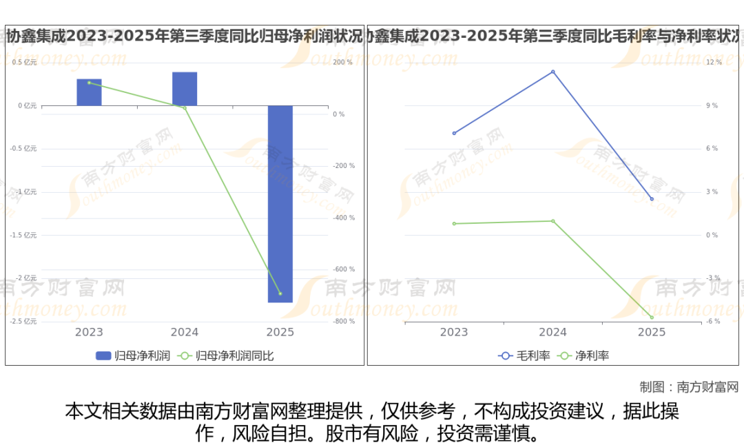 2025年第三季度季报显示,协鑫集成公司实现净利润-2.28亿,同比上年增长率为-691.81%,毛利率2.52%,归属净利润-2.28亿,同比增长-691.81%。