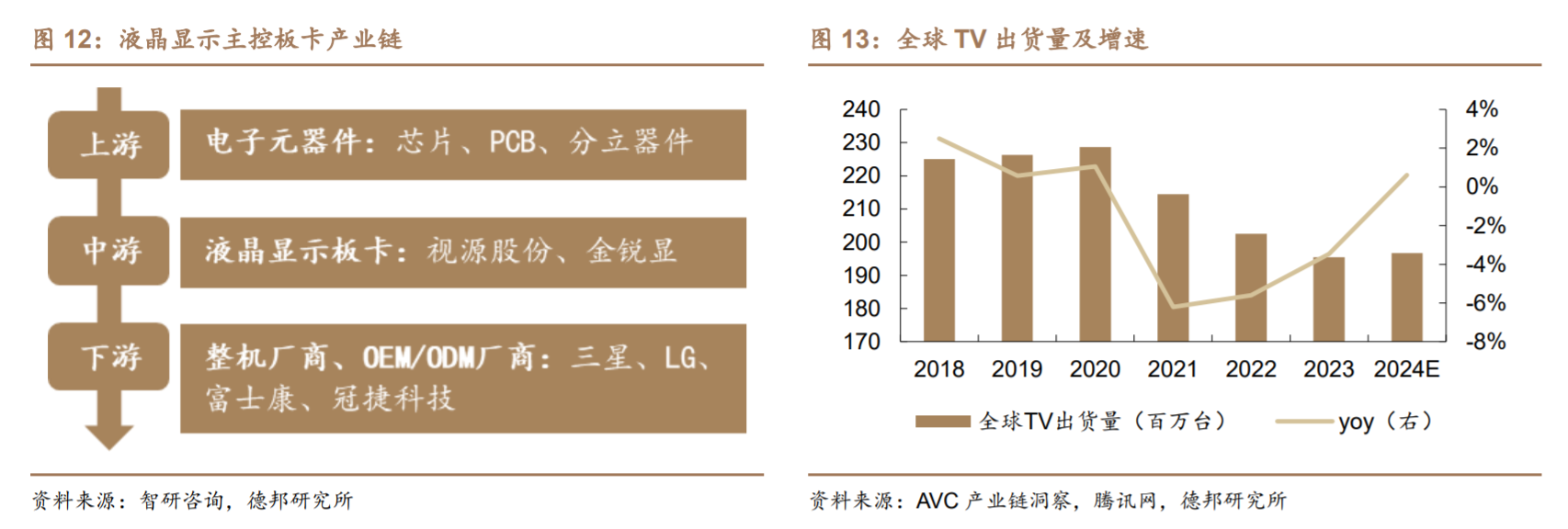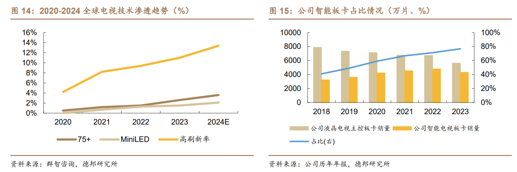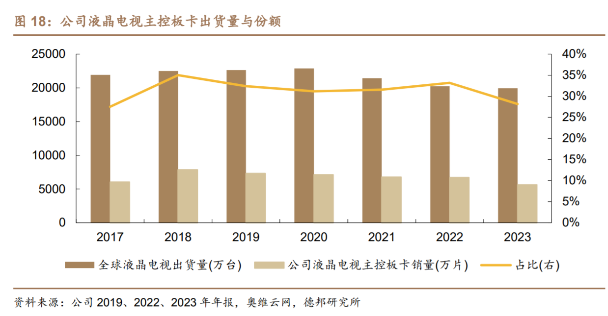 板卡业务有望恢复,智能控制器提供新增长点。从全球来看,2024年作为体育赛事大年且全球经济维持复苏态势,有望拉动TV销售;从国内来看,以旧换新政策有望刺激国内TV销售恢复。公司作为全球板卡领域龙头,有望持续受益于TV出货恢复增长。此外,公司持续加大在生活电器业务投入,为国内外家电客户提供高可靠性、高性价比的控制器等产品与服务,近些年维持高增速或提供新增长点。